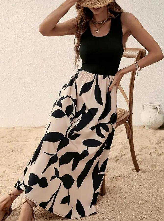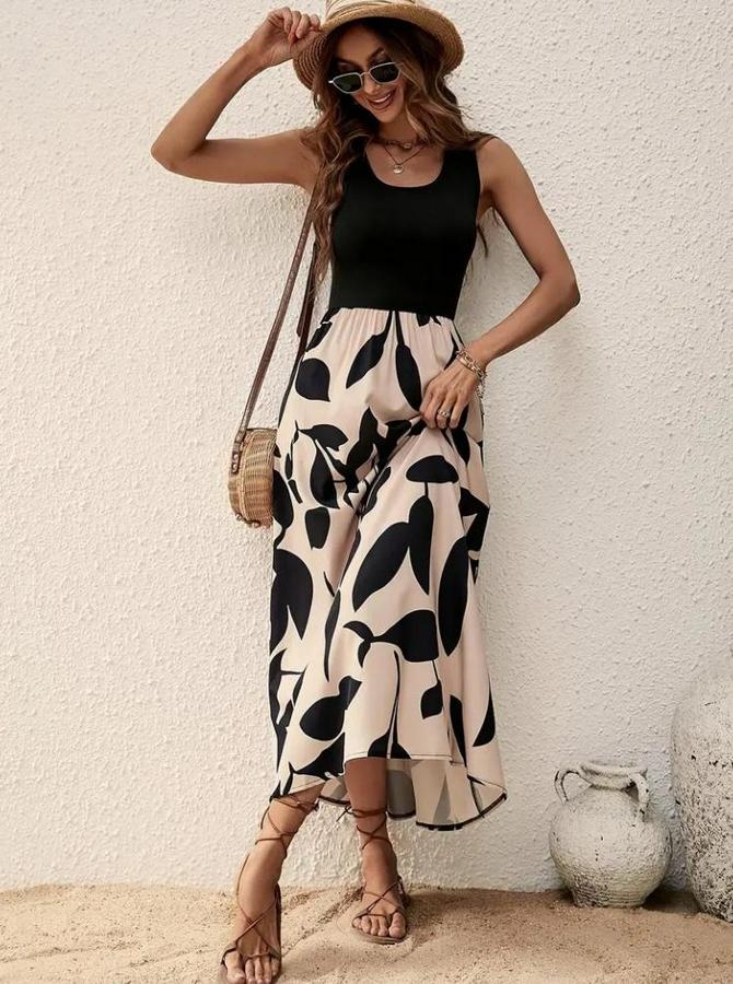 AnasayfaTüm ÜrünlerElbiseAskılı Yuvarlak Yaka Üst Viskon Alt Desenli Uzun Süprem Elbise