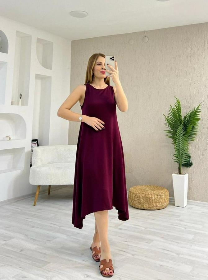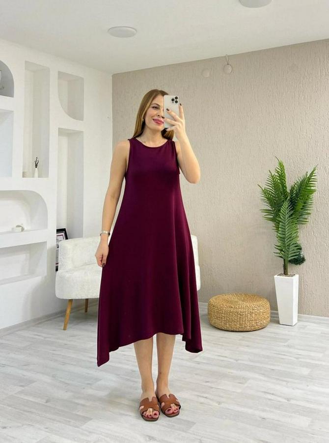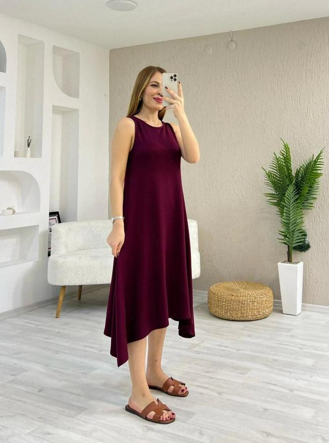 AnasayfaTüm ÜrünlerElbiseAskılı Yuvarlak Yakalı Asimetrik Kesim Detaylı Viskon Elbise