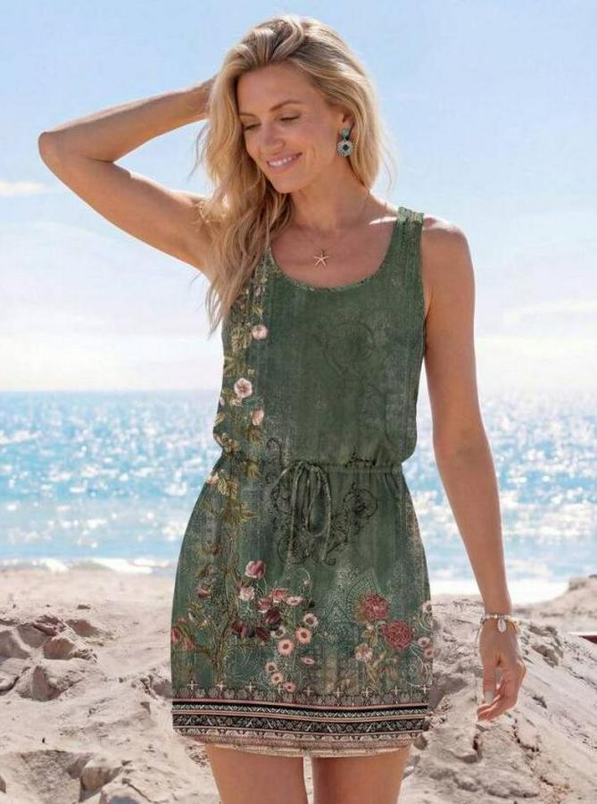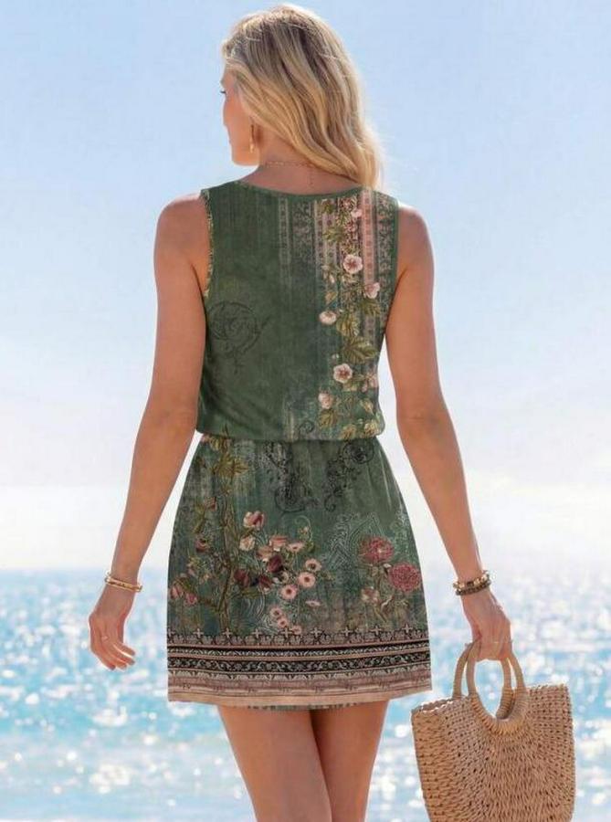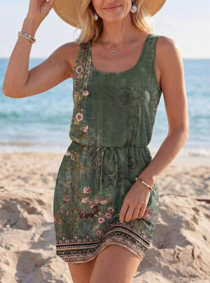 Askılı Yuvarlak Yakalı Beli Kusaklı Çiçek Desenli Kısa Süprem Elbise