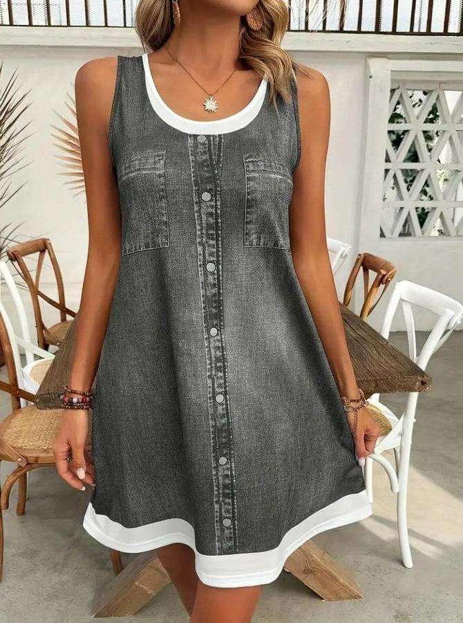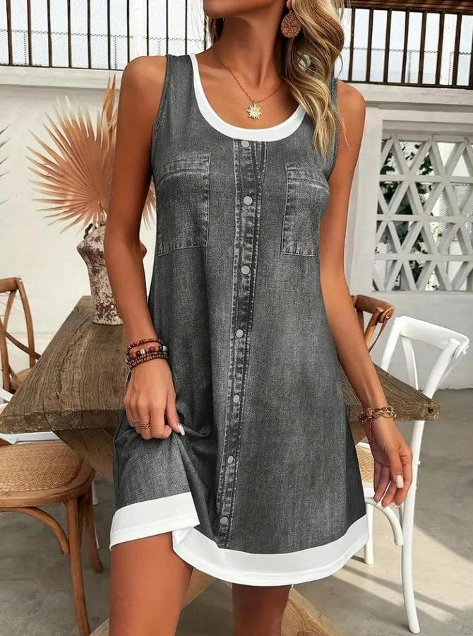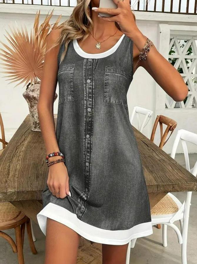 Askılı Yuvarlak Yakalı Kot Görünümlü Kısa Süprem Elbise