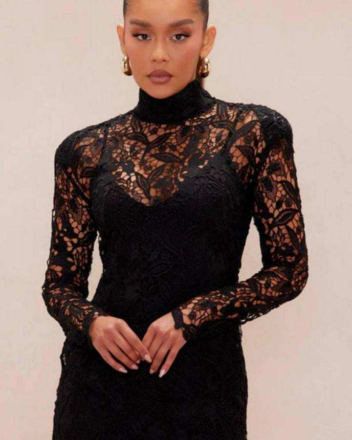 AnasayfaTüm ÜrünlerElbiseBalıkçı Yaka Full Dantel Güpür Mini Elbise