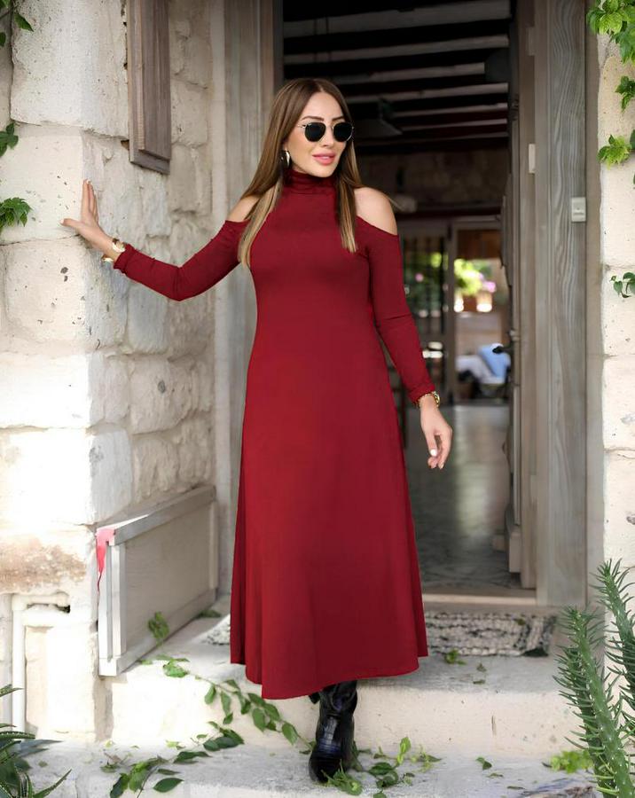 AnasayfaTüm ÜrünlerElbiseBalıkçı Yaka Omuzlardan Açık Uzun Kollu Janjan Krep Elbise