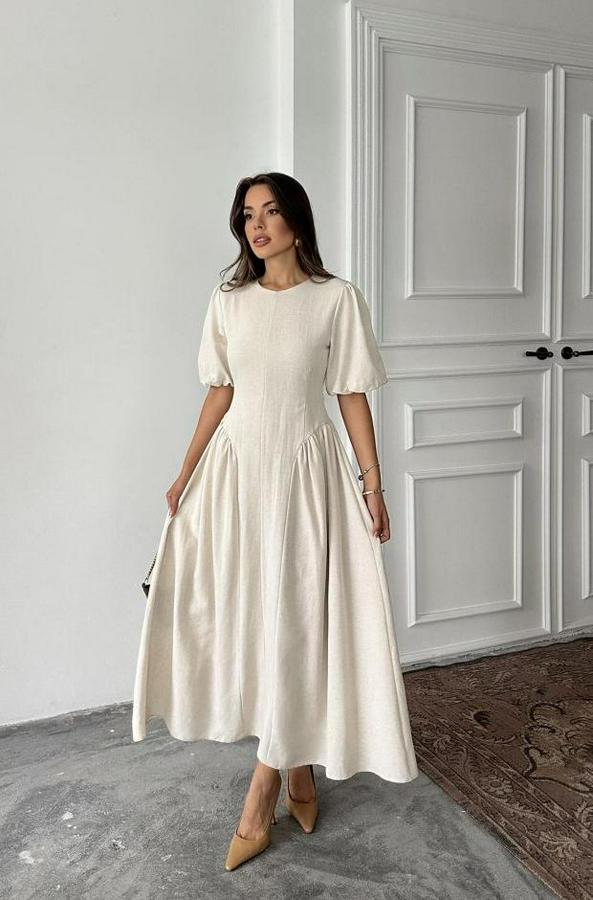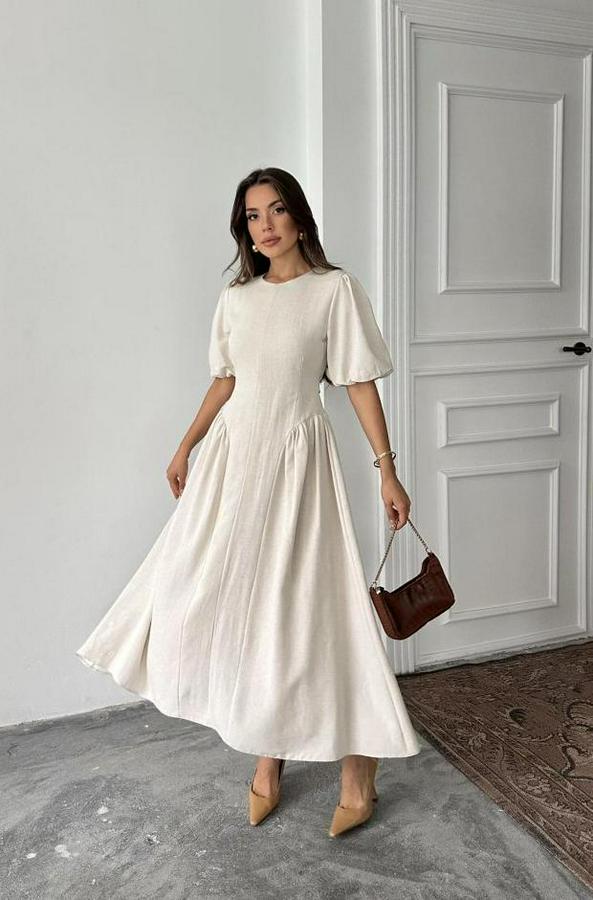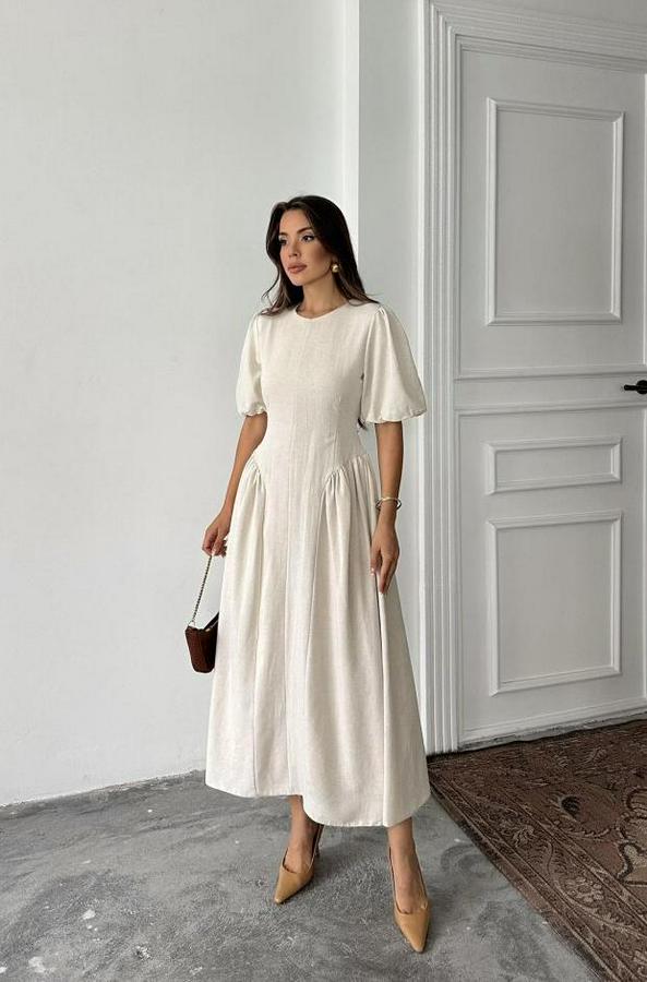 AnasayfaTüm ÜrünlerElbiseBej Arkadan Bağlamalı Büzgülü Keten Elbise