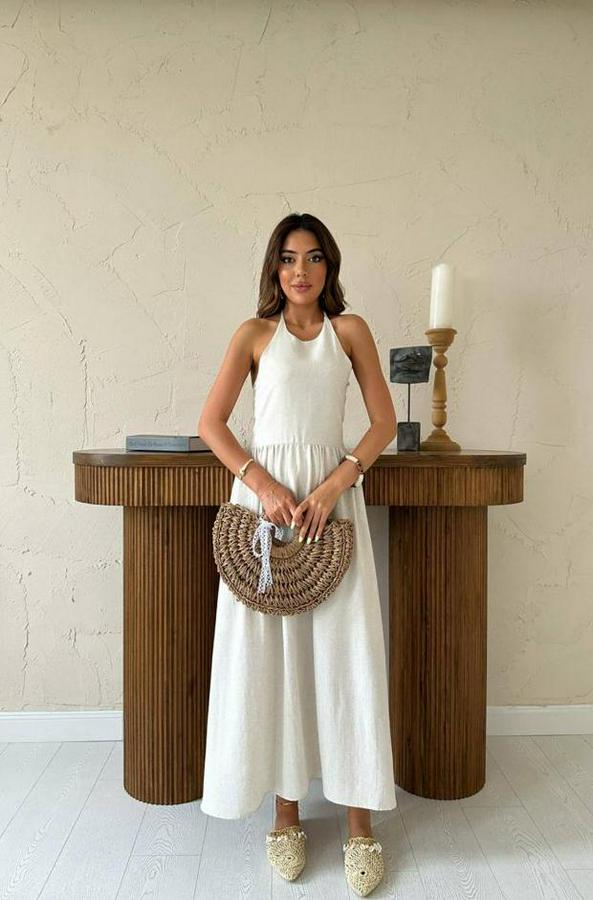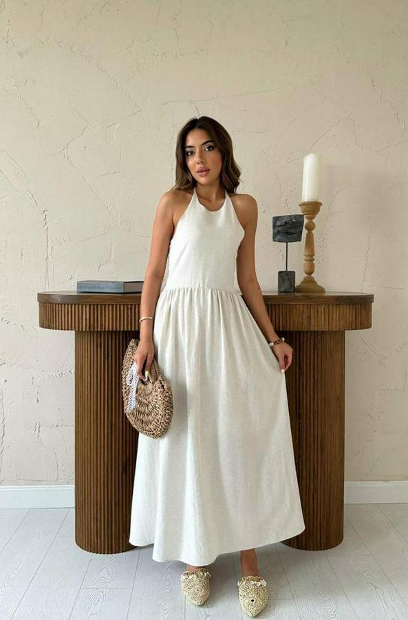 AnasayfaTüm ÜrünlerElbiseBej Arkası Gipeli Keten Elbise