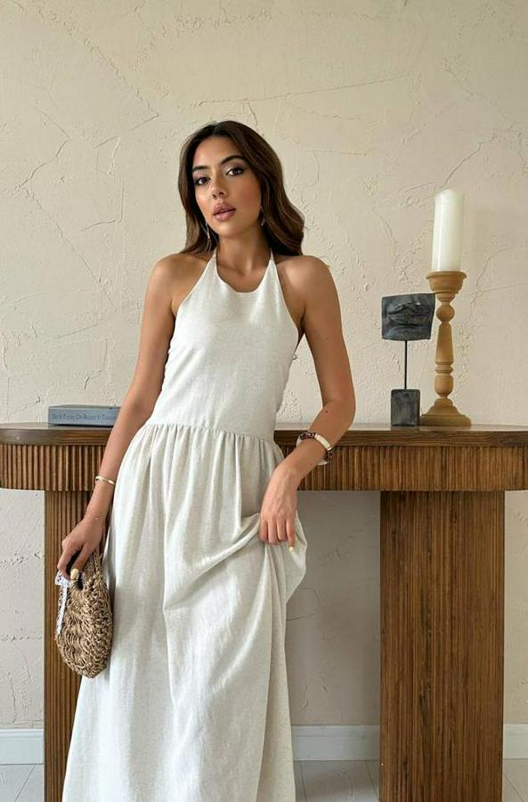 Bej Arkası Gipeli Keten Elbise