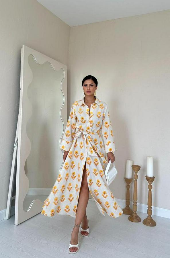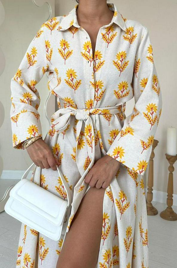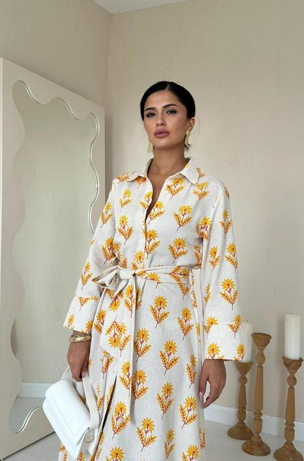 AnasayfaTüm ÜrünlerElbiseBej Desenli Ve Önü Düğmeli Keten Elbise