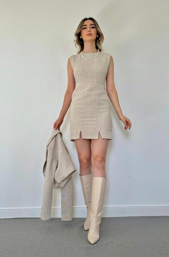 AnasayfaTüm ÜrünlerElbiseBej Düğmeli Ceket Ve Elbise Takım