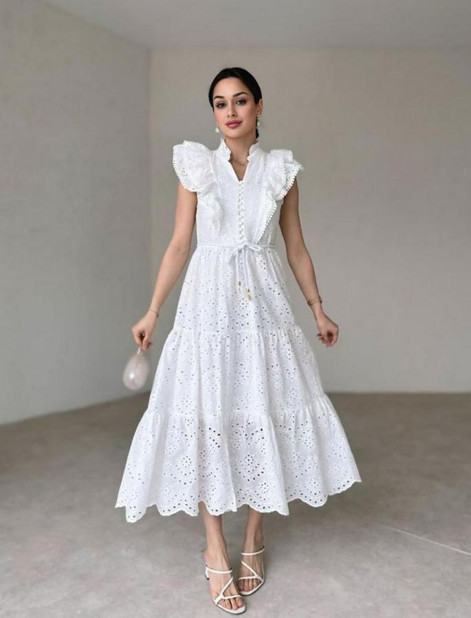 Beyaz Fırfırlı Düğmeli Elbise