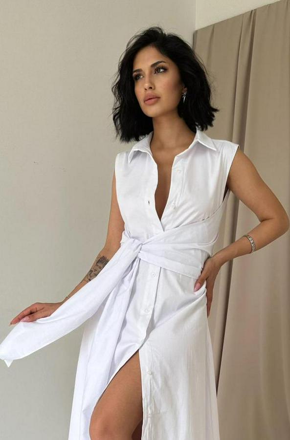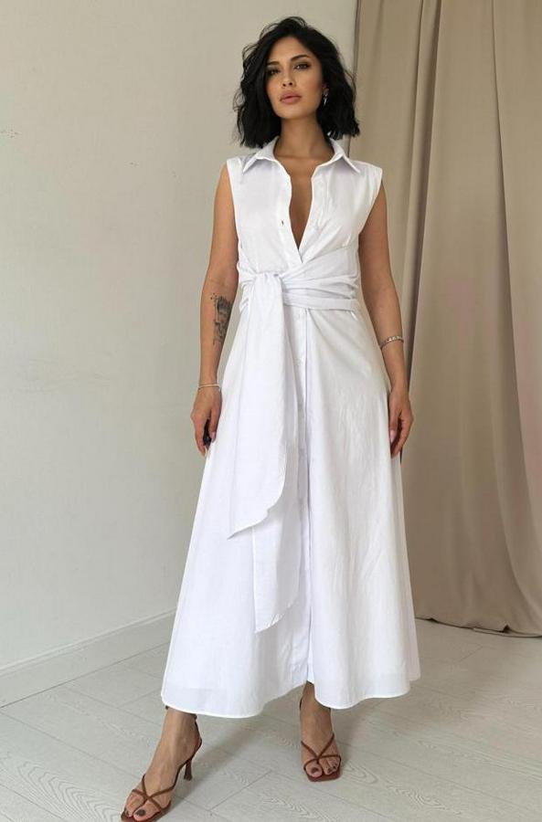 Beyaz Gömlek Yaka Bağlamalı Elbise