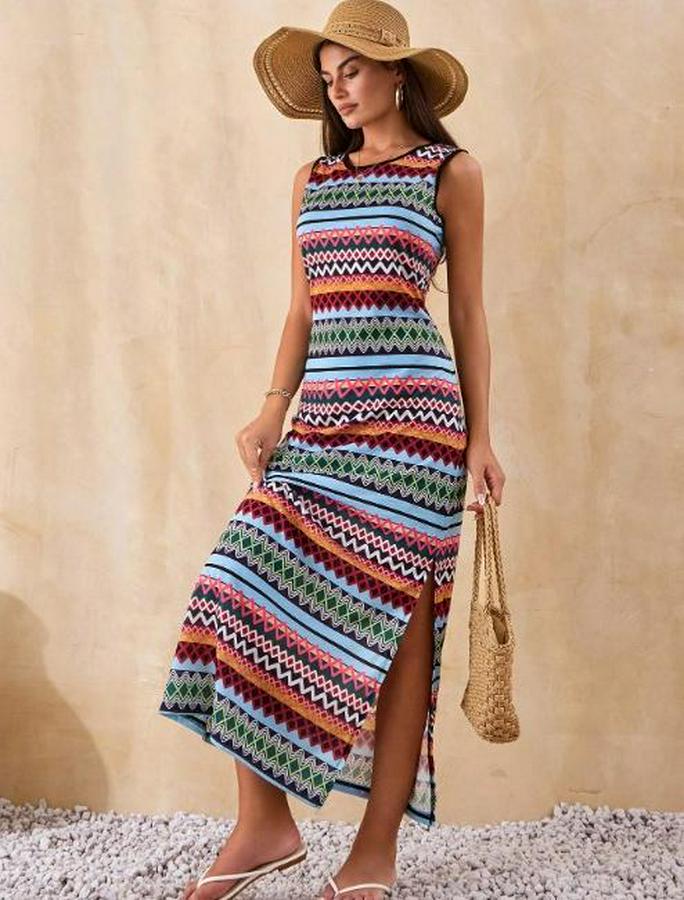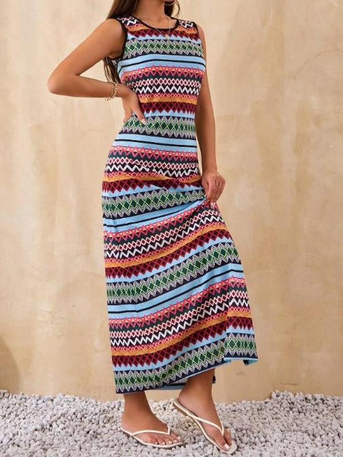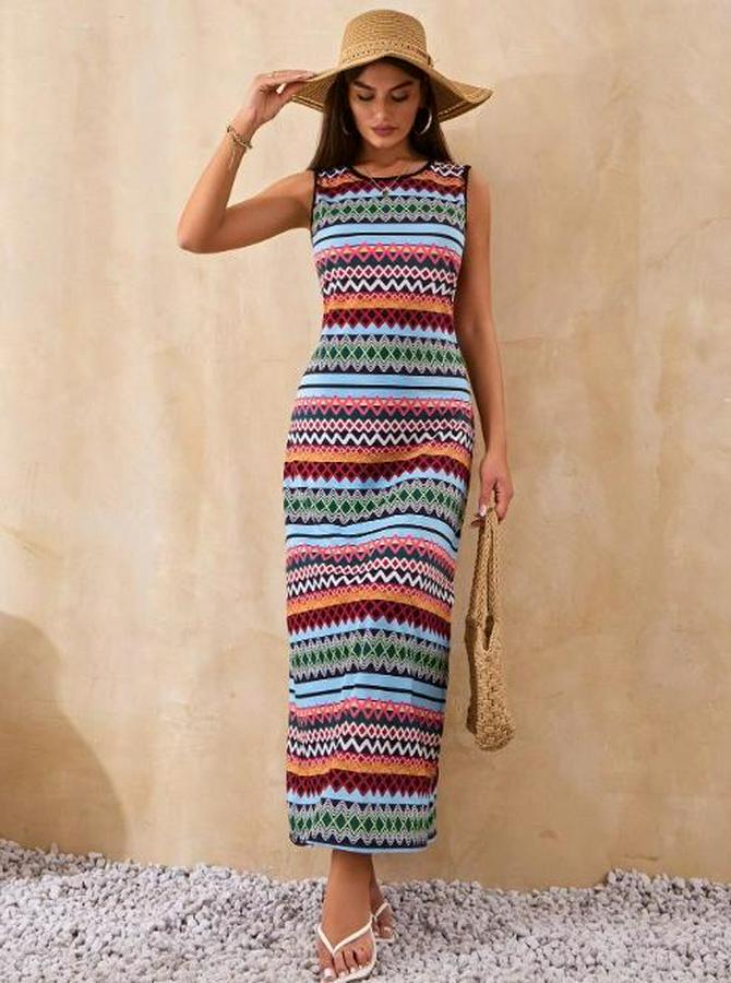 Bisiklet Yaka Cizgi Desen Süprem Elbise