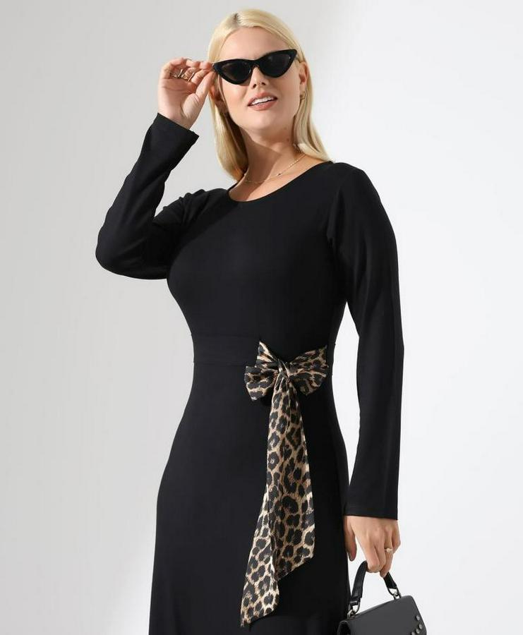 Kadın Bisiklet Yaka Leopar Fiyonk Detay Maxi Boy Elbise