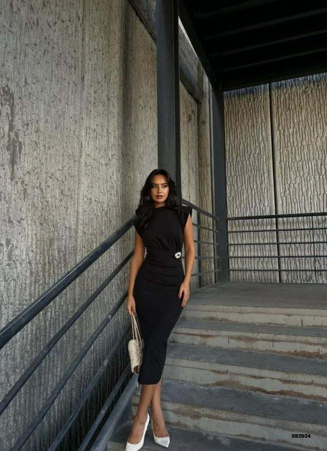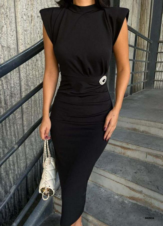 AnasayfaTüm ÜrünlerElbiseBisiklet Yaka Vatkalı Broş Detay Kısa Kol Midi Boy Elbise