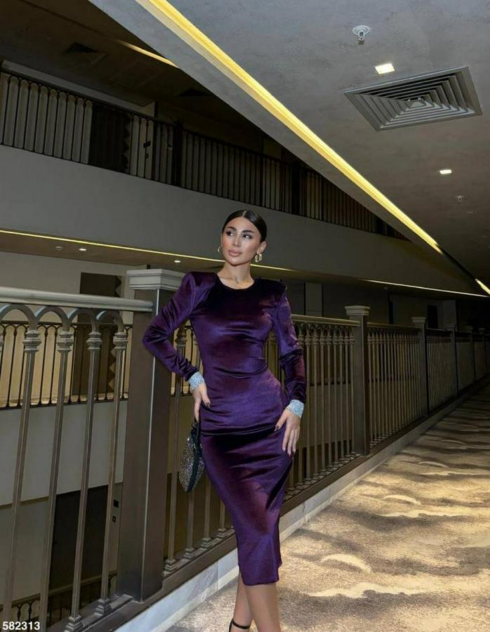 AnasayfaTüm ÜrünlerElbiseBisiklet Yaka Vatkalı Manşet Detay Kadife Kumaş Midi Boy Elbise