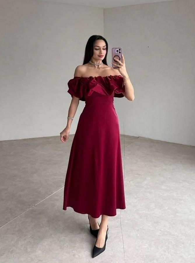 AnasayfaTüm ÜrünlerElbiseBordo Omuz Büzgülü Saten Elbise