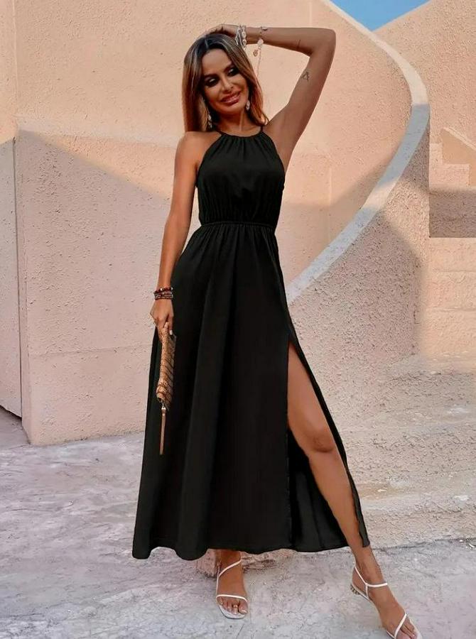 Boyundan Askılı Belden Lastikli Yandan Yırtmaç Detaylı Viskon Elbise