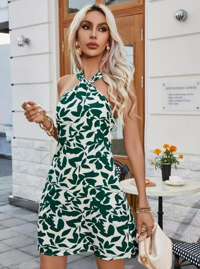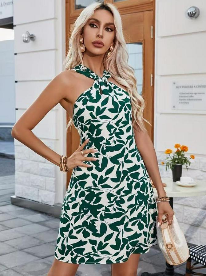 Kadın Boyundan çapraz Askı Damla Detaylı Omuzlardan Açık Desenli Kısa Süprem Elbise