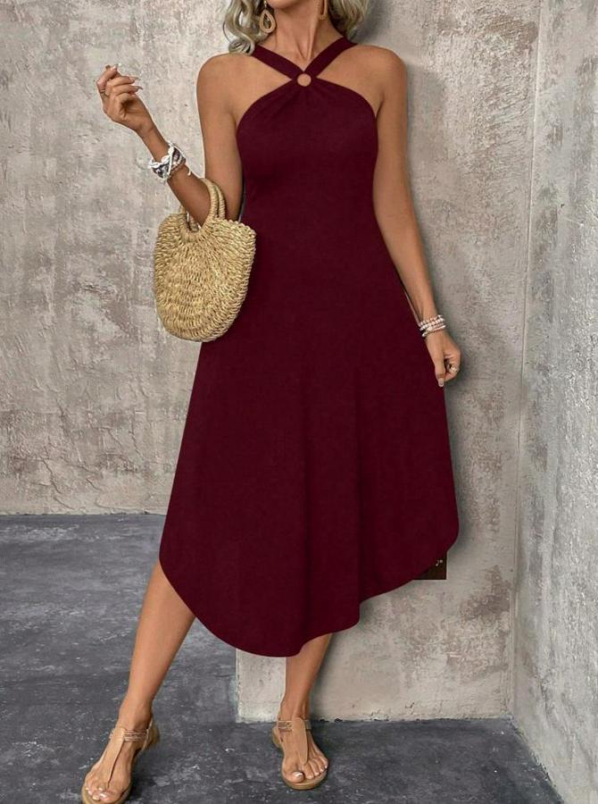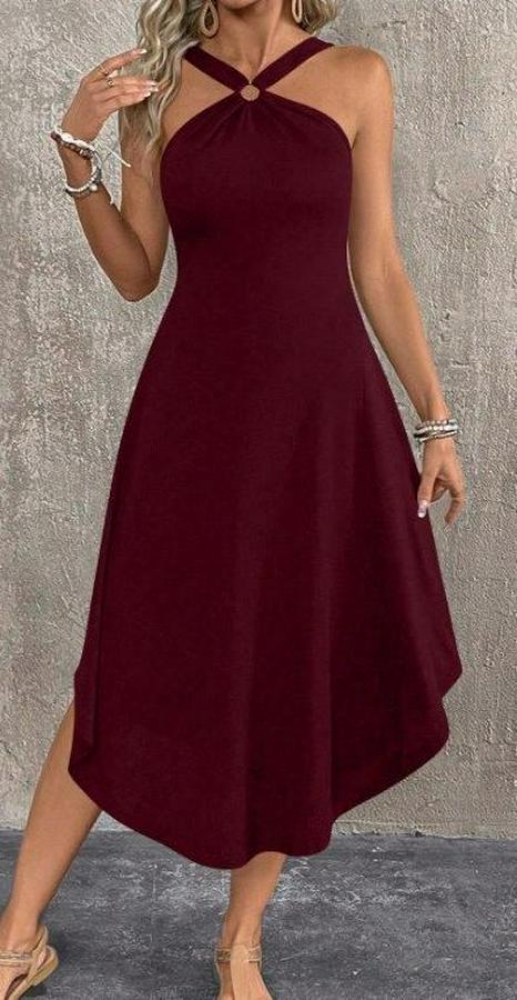 AnasayfaTüm ÜrünlerElbiseBoyundan Çapraz Askılı Halka Detaylı Asimetrik Kesim Viskon Elbise