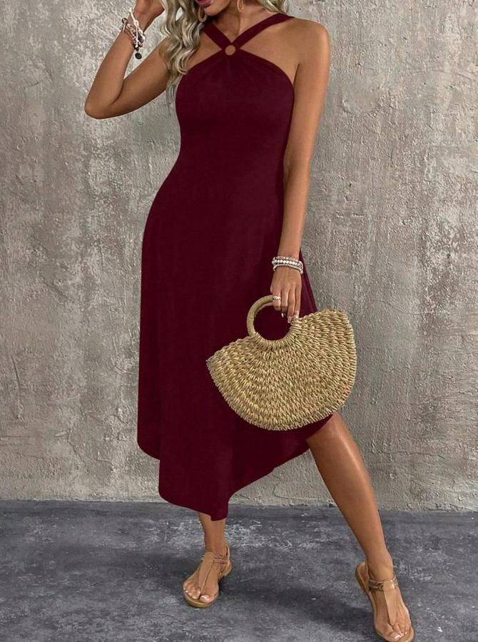 Kadın Boyundan çapraz Askılı Halka Detaylı Asimetrik Kesim Viskon Elbise