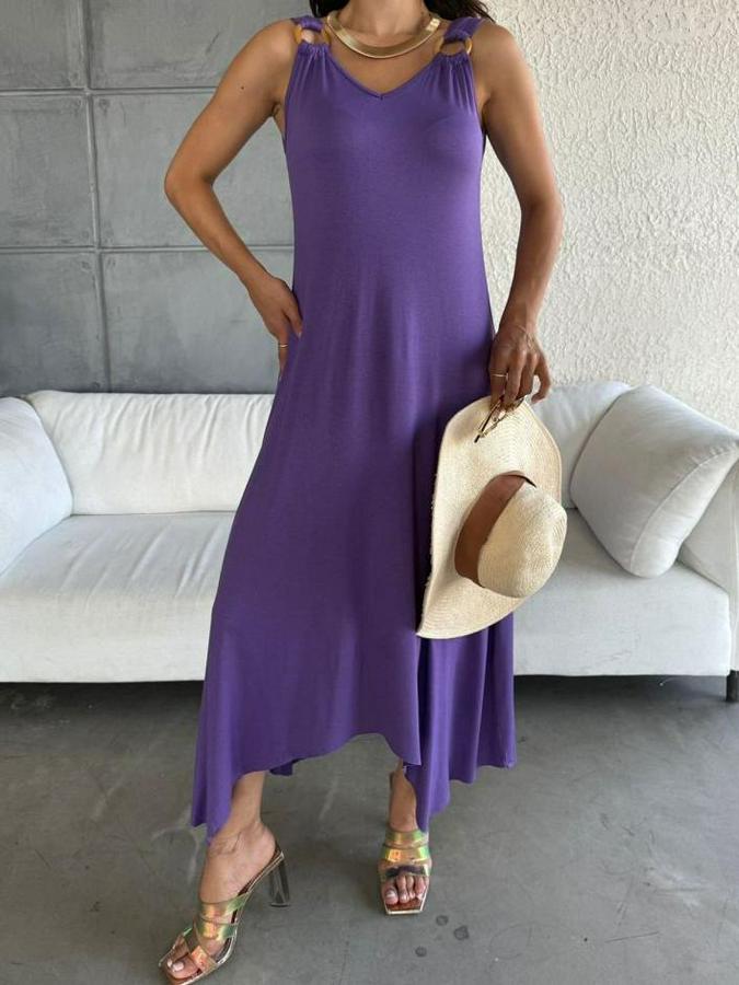Kadın çan Dokuma Kumaş V Yaka Asimetrik Kesim Elbise