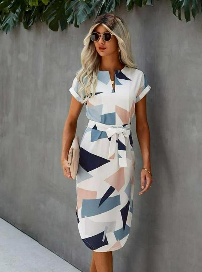 Kadın çentik Yaka Geometrik Desen Baskılı Mikro Kumaş Midi Moy Elbise
