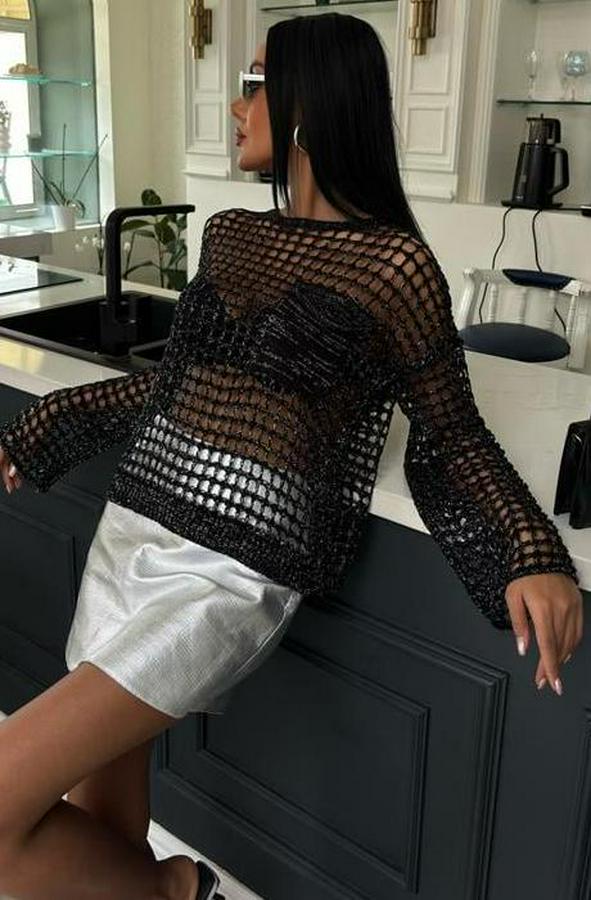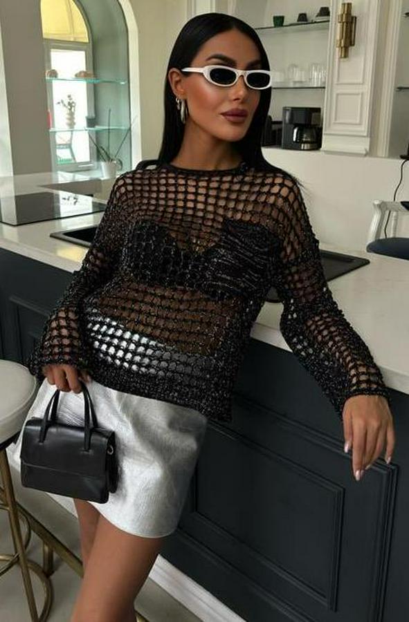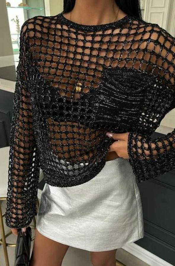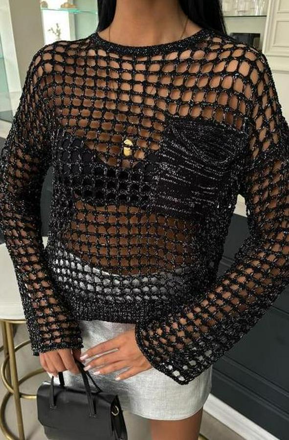 AnasayfaTüm ÜrünlerElbiseCep Detay Simli Ajurlu Triko Bluz 1361