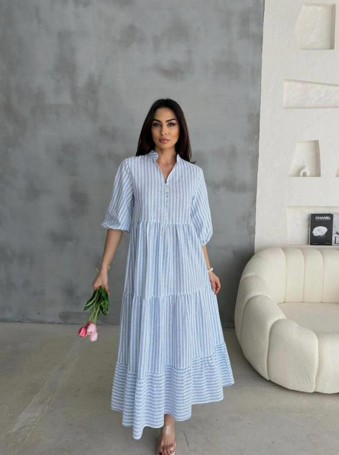 ÇİZGİLİ KETEN HAKİM YAKA DÜĞMELİ SALAŞ ELBİSE - Mavi