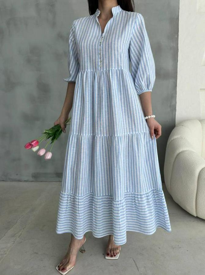 Çizgili Keten Hakim Yaka Düğmeli Salaş Elbise