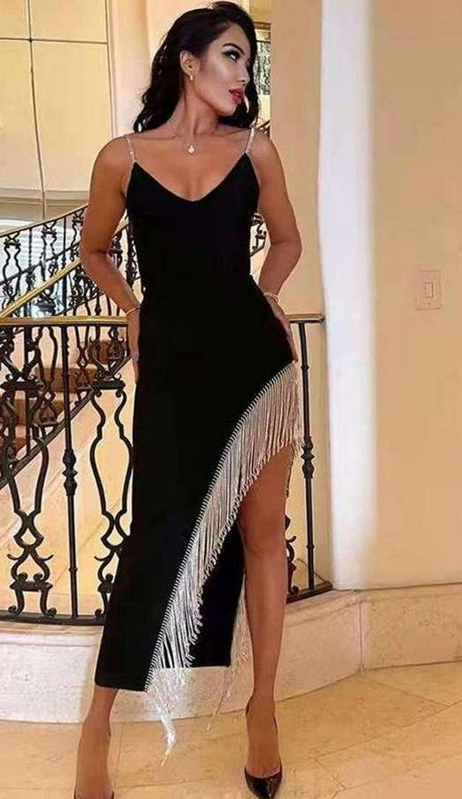 AnasayfaTüm ÜrünlerElbiseDagıç Kumaş Saçaklı Taşlı Askılı Midi Boy Elbise