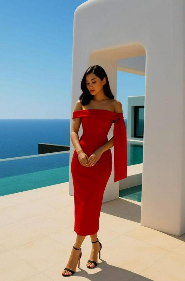 Dalgıç Krep Kumaş Madonna Yaka Midi Boy Elbise