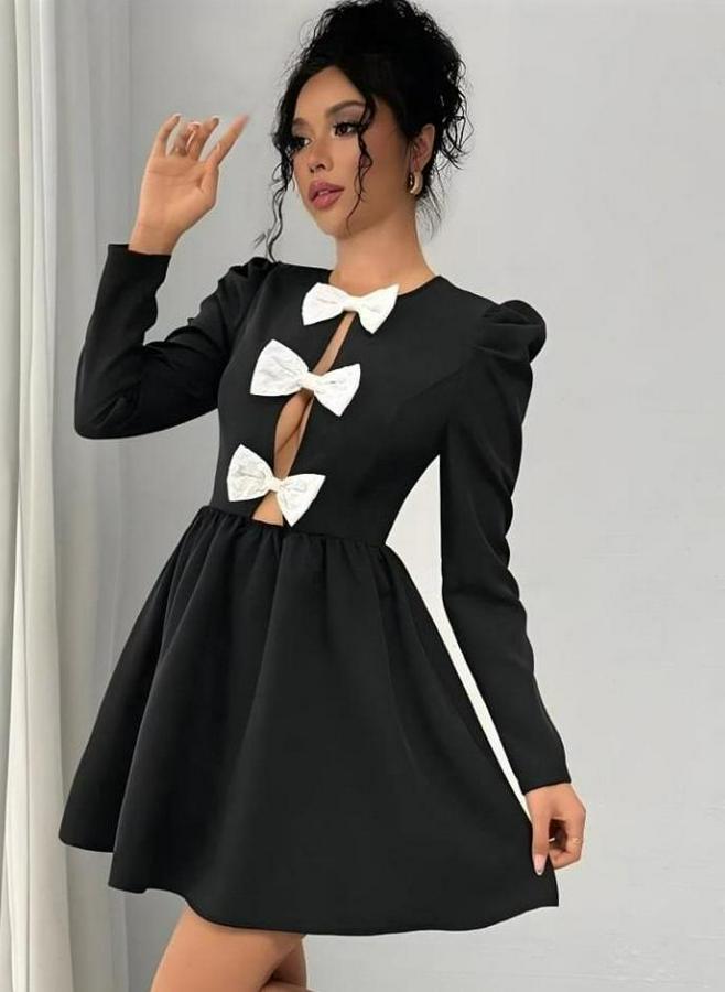 Kadın Dalgıç Kumaş Fiyonk Detaylı Uzun Kollu Mini Boy Elbise