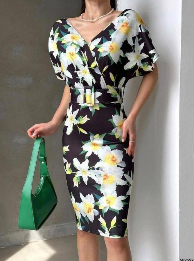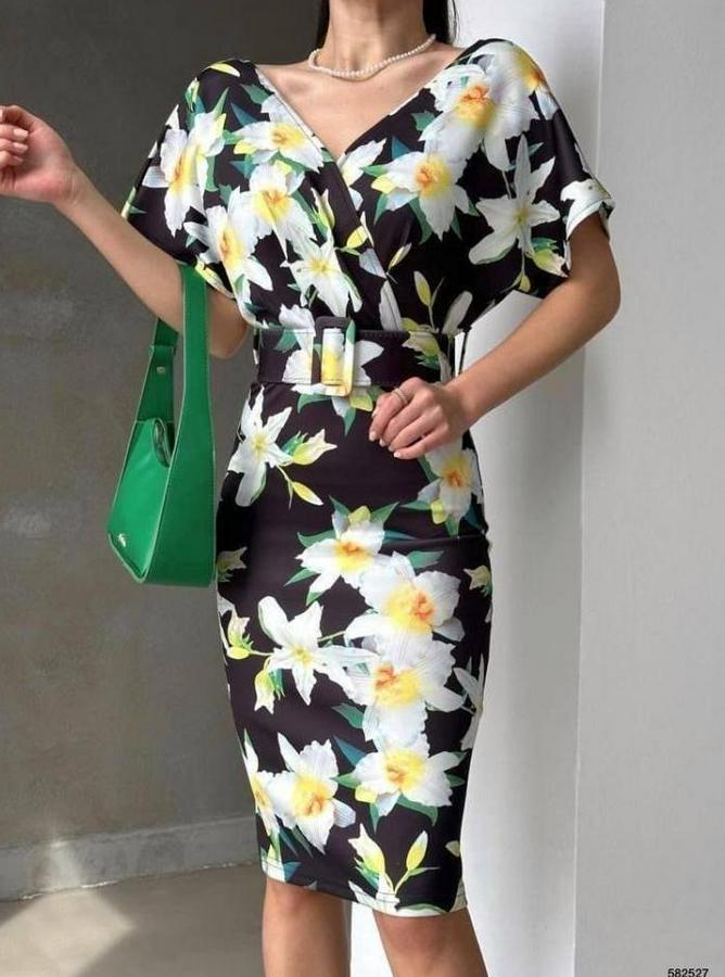 Kadın Dalgıç Kumaş V Yaka çiçek Desenli Kuşaklı Kalem Elbise
