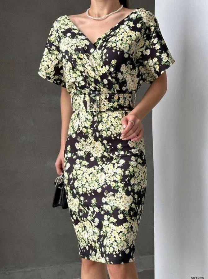 AnasayfaTüm ÜrünlerElbiseDalgıç Kumaş V Yaka Çiçek Desenli Kuşaklı Kalem Elbise
