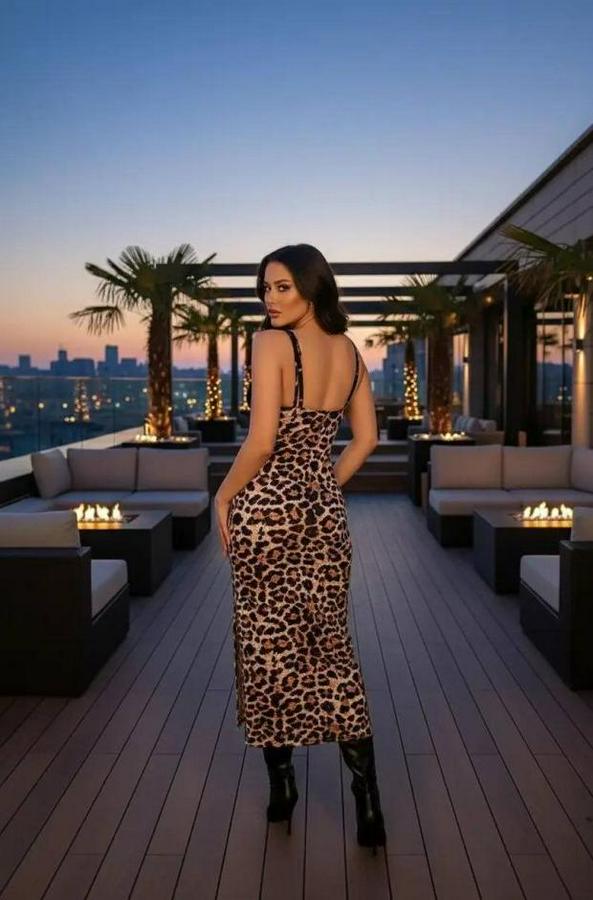 AnasayfaTüm ÜrünlerElbiseDantel Detay Omuz Askılı Leopar Desen Maxi Yırtmaçlı Gloplu Elbise