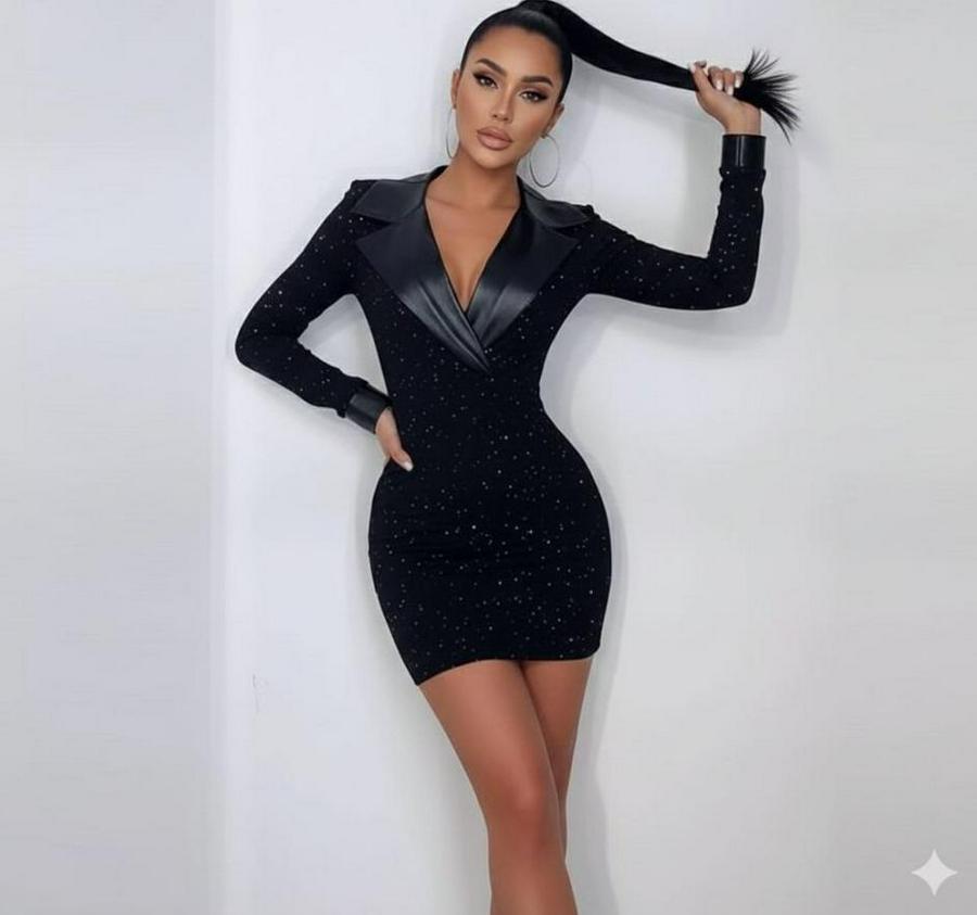 AnasayfaTüm ÜrünlerElbiseDeri Detaylı Manşet Yaka Simli Fukara Kumaş Mini Elbise
