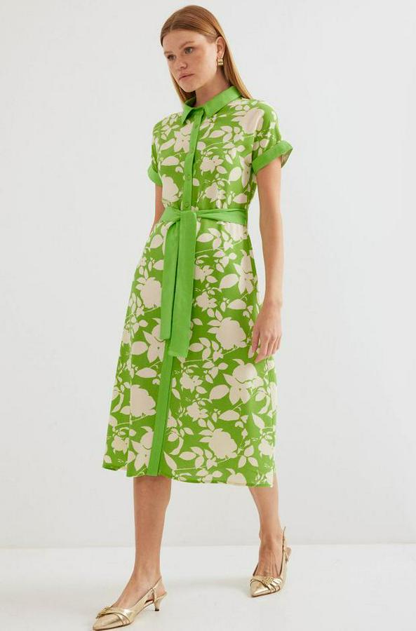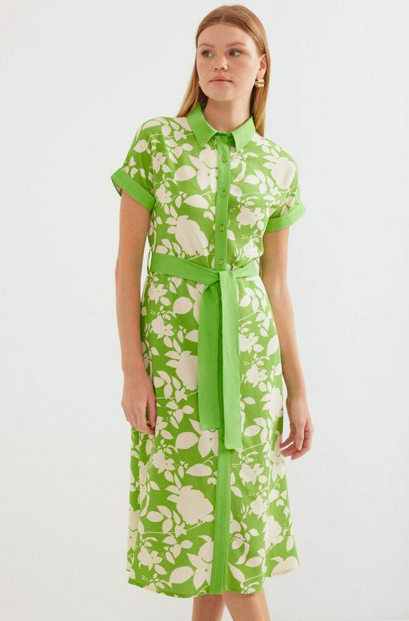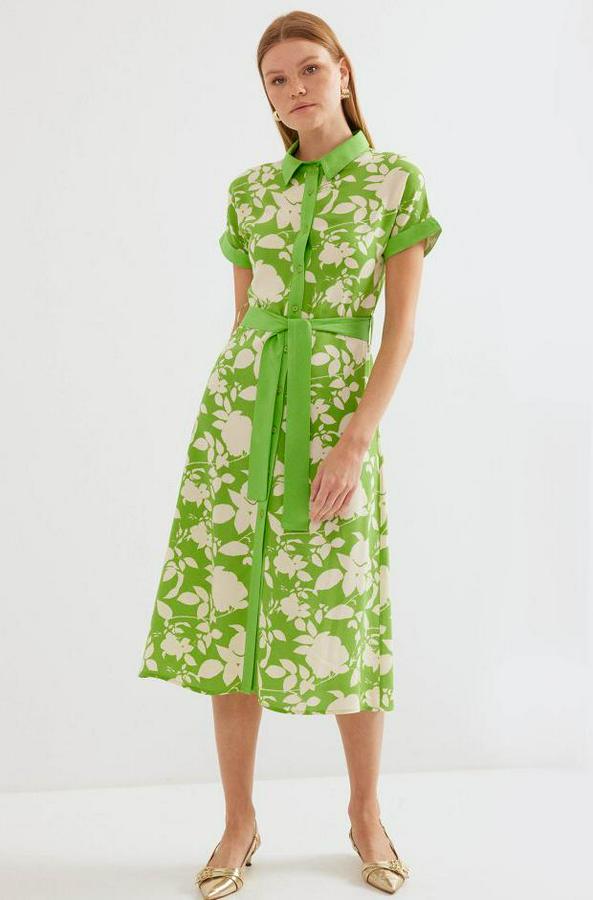 2455 Desenli Gömlek Elbise - Yeşil