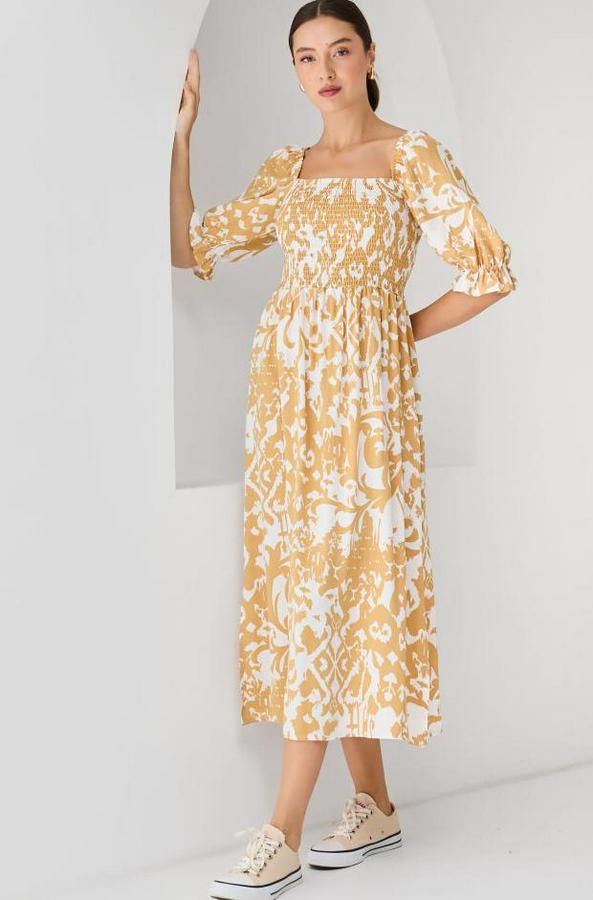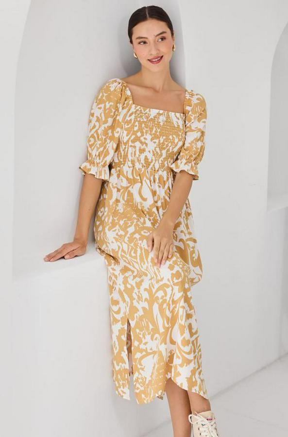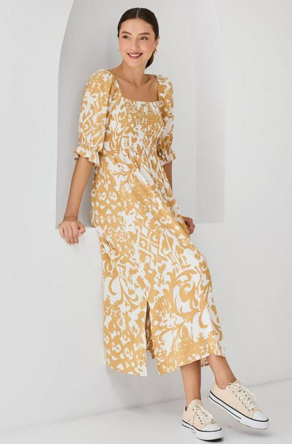 2512 Desenli Yırtmaçlı Elbise - Sarı