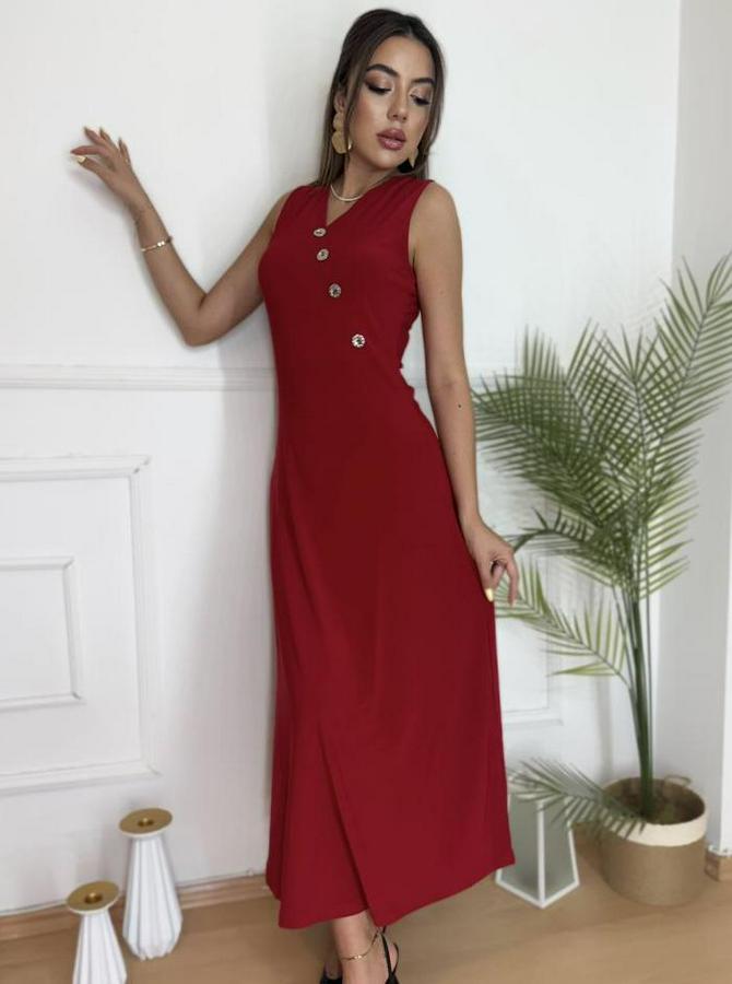 Kadın Düğme Detay Kolsuz Maxi Boy Elbise