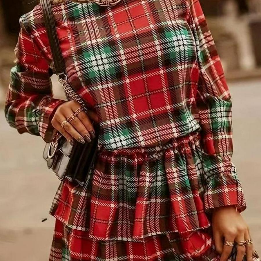 AnasayfaTüm ÜrünlerElbiseEkose Kumaş Dijital Baskılı Uzun Kollu Mini Boy Elbise