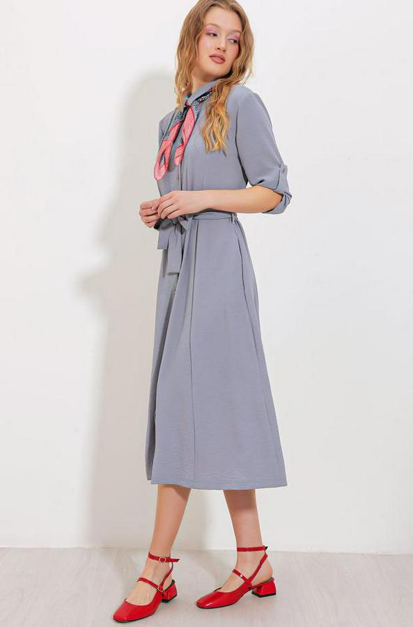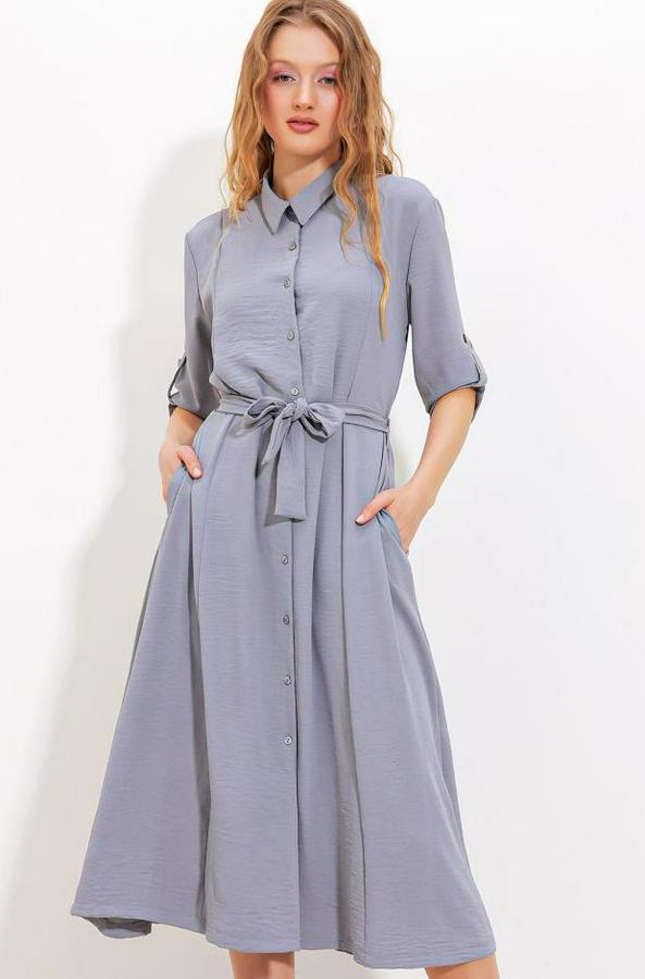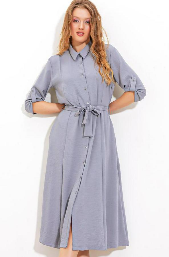 AnasayfaTüm ÜrünlerElbiseGri Kuşaklı Gömlek Elbise 2442