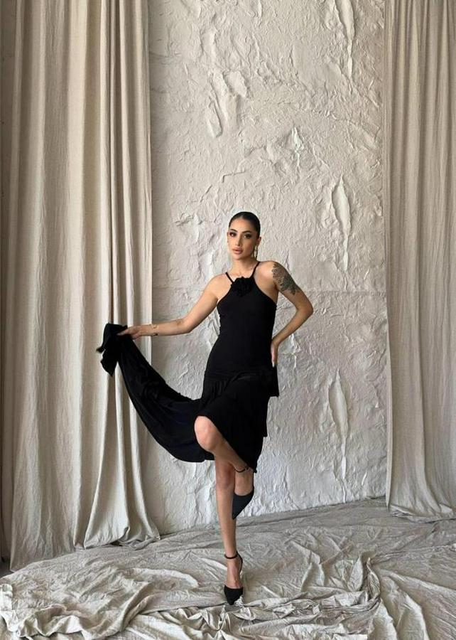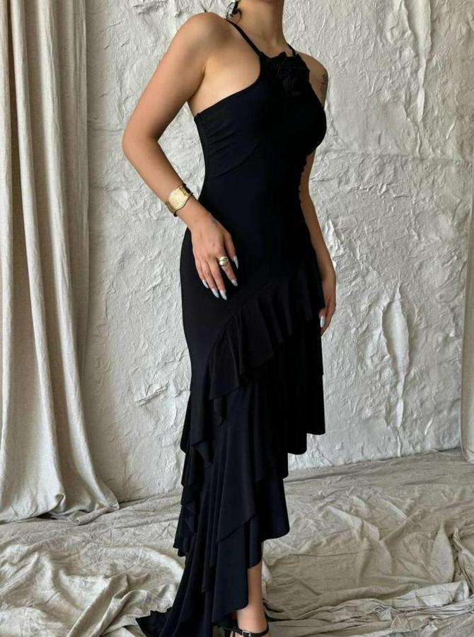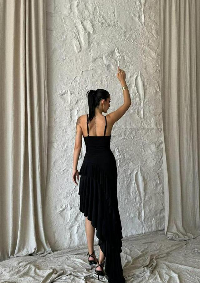 GÜLLÜ ELBİSE ASİMETRİK KATLI - Siyah