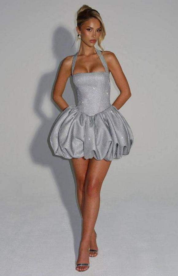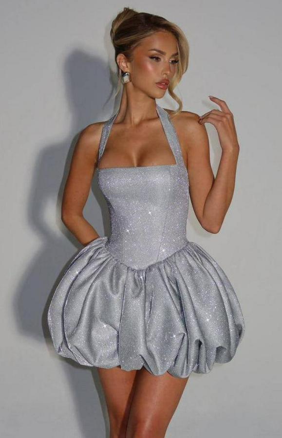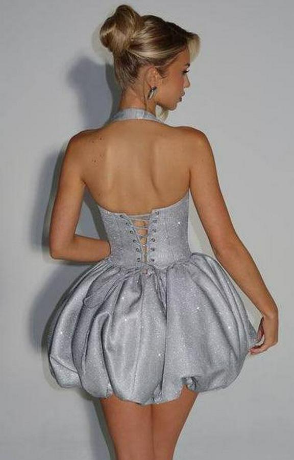 AnasayfaTüm ÜrünlerElbiseHalter Yaka Simli Kumaş Sırtı Bağcık Detay Prenses Elbise