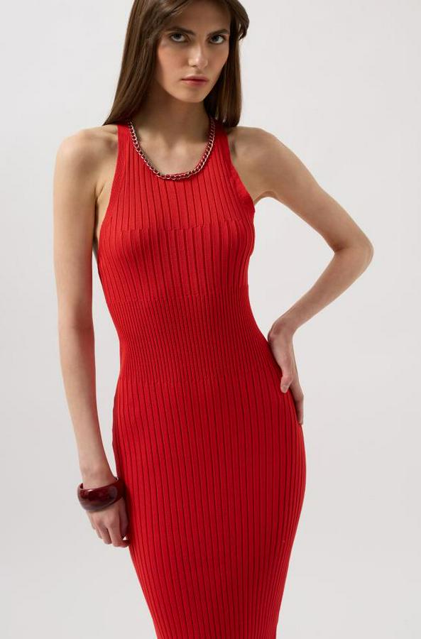 AnasayfaTüm ÜrünlerElbiseHalter Yaka Zincir Aksesuarlı Çapraz Askılı Elbise