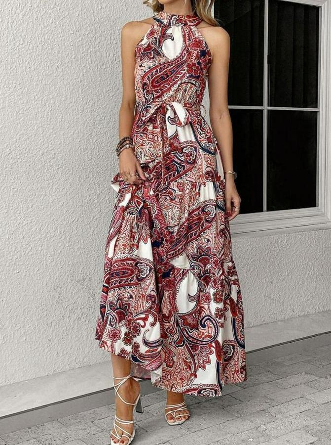 Halter Yakalı Omuzlardan Açık Kuşaklı Maksi Boy Desenli Süprem Elbise