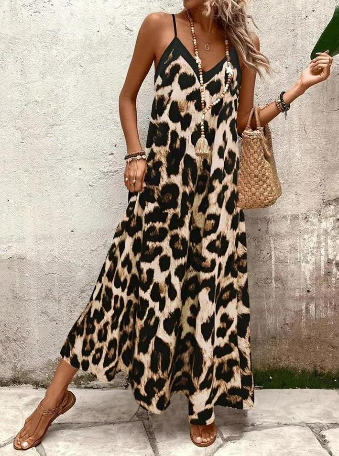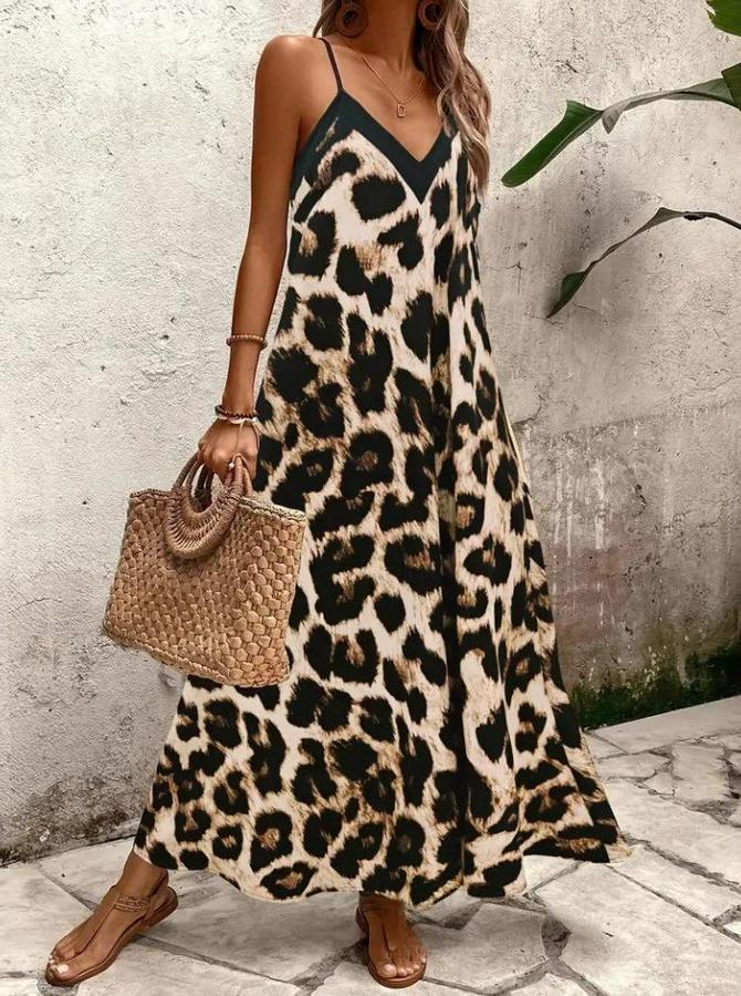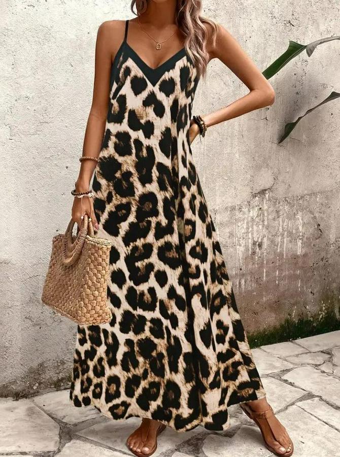 Kadın Ip Askılı Geniş V Yakalı Leopar Desenli Süprem Elbise