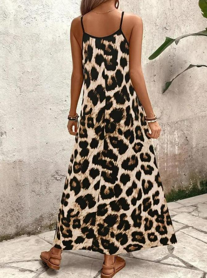 Ip Askılı Geniş V Yakalı Leopar Desenli Süprem Elbise