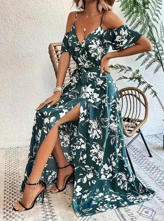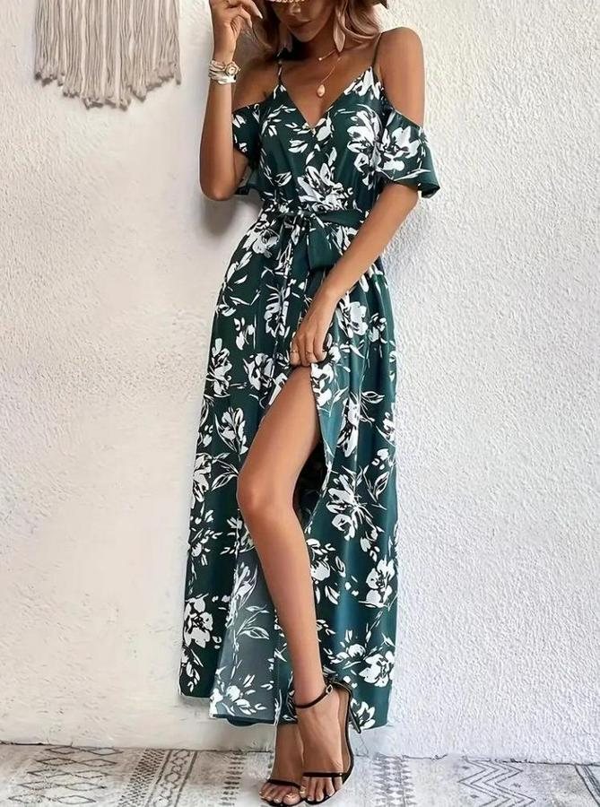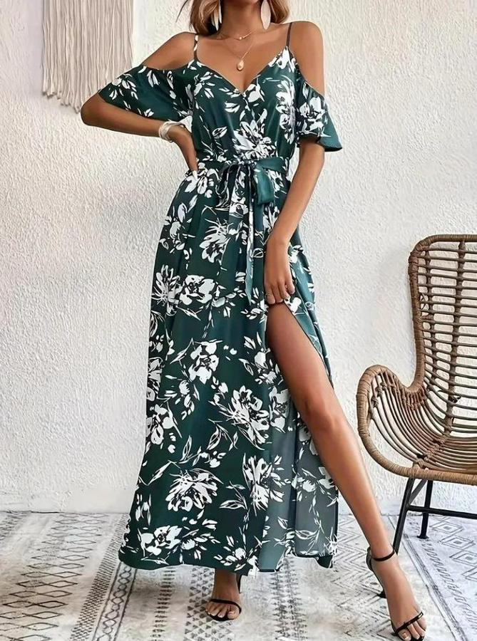Kadın Ip Askılı Kısa Kollu Kruvaze Yakalı Yırtmaçlı Desenli Süprem Elbise