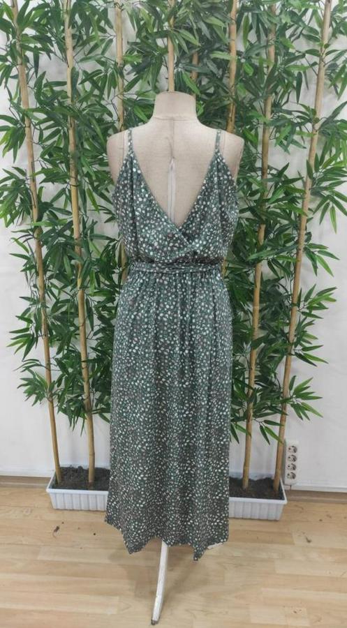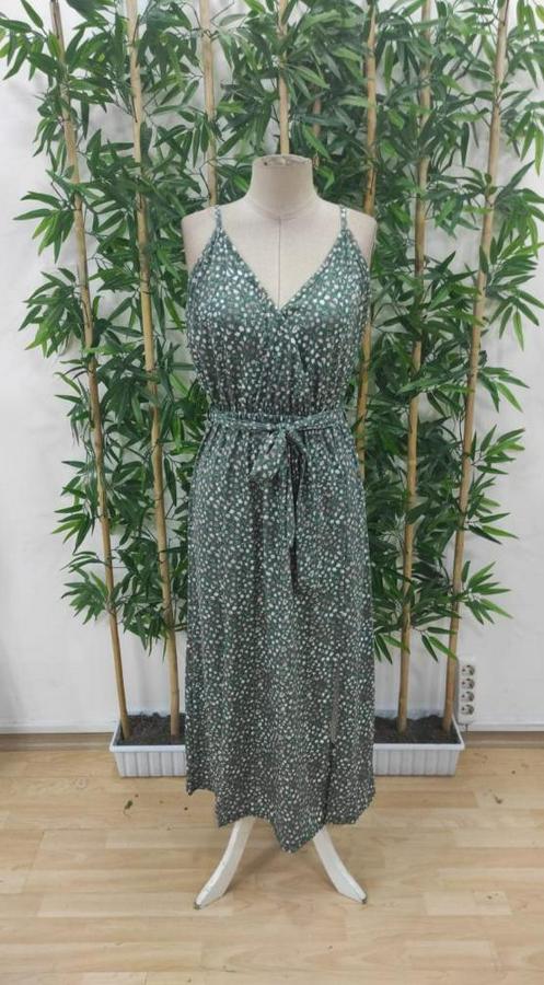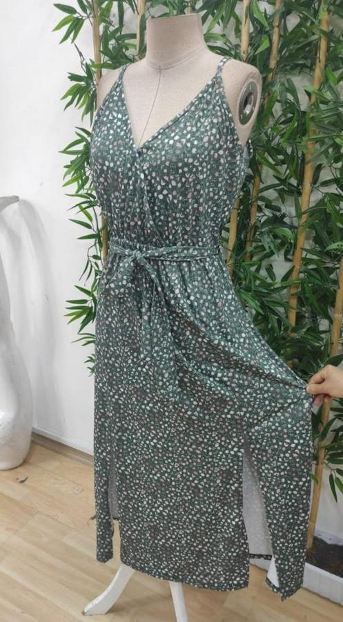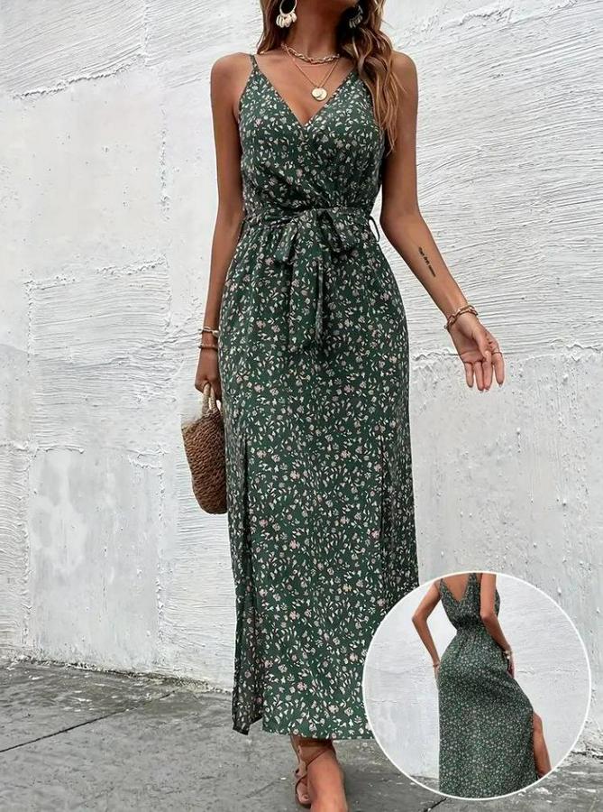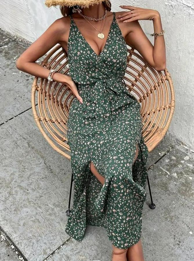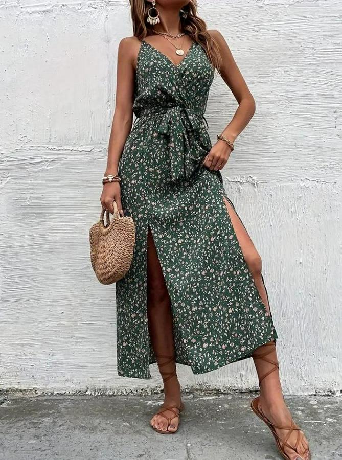 Kadın Ip Askılı Kruvaze Yakalı Yırtmaçlı Uzun Desenli Kuşaklı Süprem Elbise
