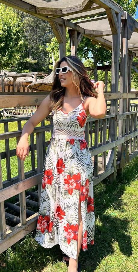 Ip Askılı V Yakalı Bel Güpür Çiçek Desenli Yandan Yırtmaçlı Maksi Süprem Elbise