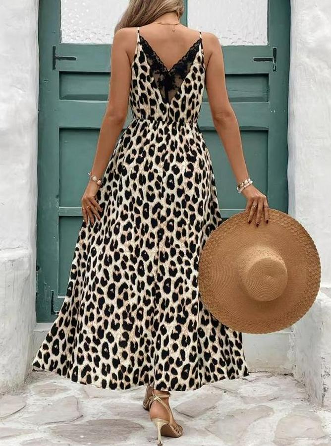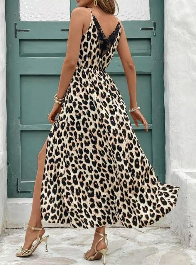 Kadın Ip Askılı Yuvarlak Yakalı Arkası V Yakalı Yırtmaçlı Uzun Leopar Desenli Süprem Elbise