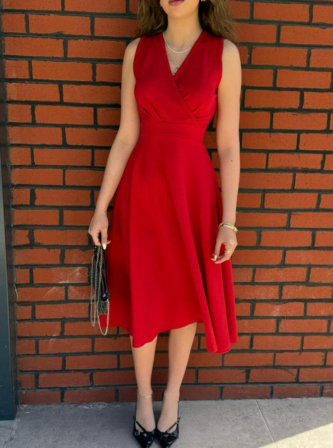 Kadın Ithal Krep Kumaş Kruvaze Yaka Eteği Kloş Kolsuz Mini Elbise